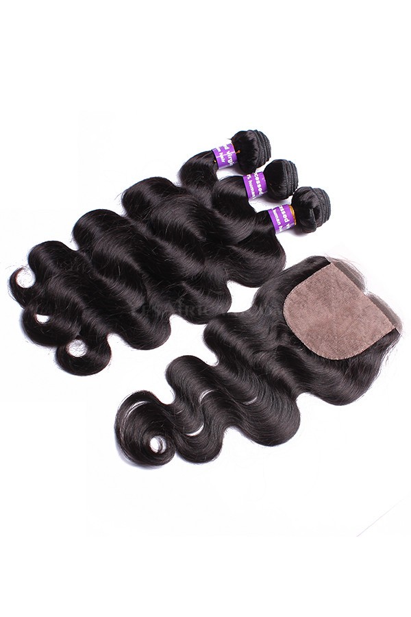 Brazilian Virgin Hair Body Wave 4X4inches Middle Part Silk Base Closure with 3pcs Weaves