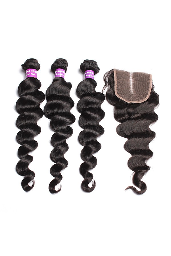Mongolian Virgin Hair Loose Wave Middle Part Lace Closure with 3pcs Weaves